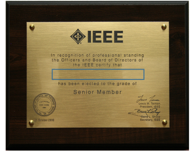 Placa de Membro Sênior: Uma placa gravada que você pode exibir com orgulho para colegas, clientes e empregadores. A placa, uma bela madeira atraente com gravura em bronze, é enviada aproximadamente oito semanas após a elevação.